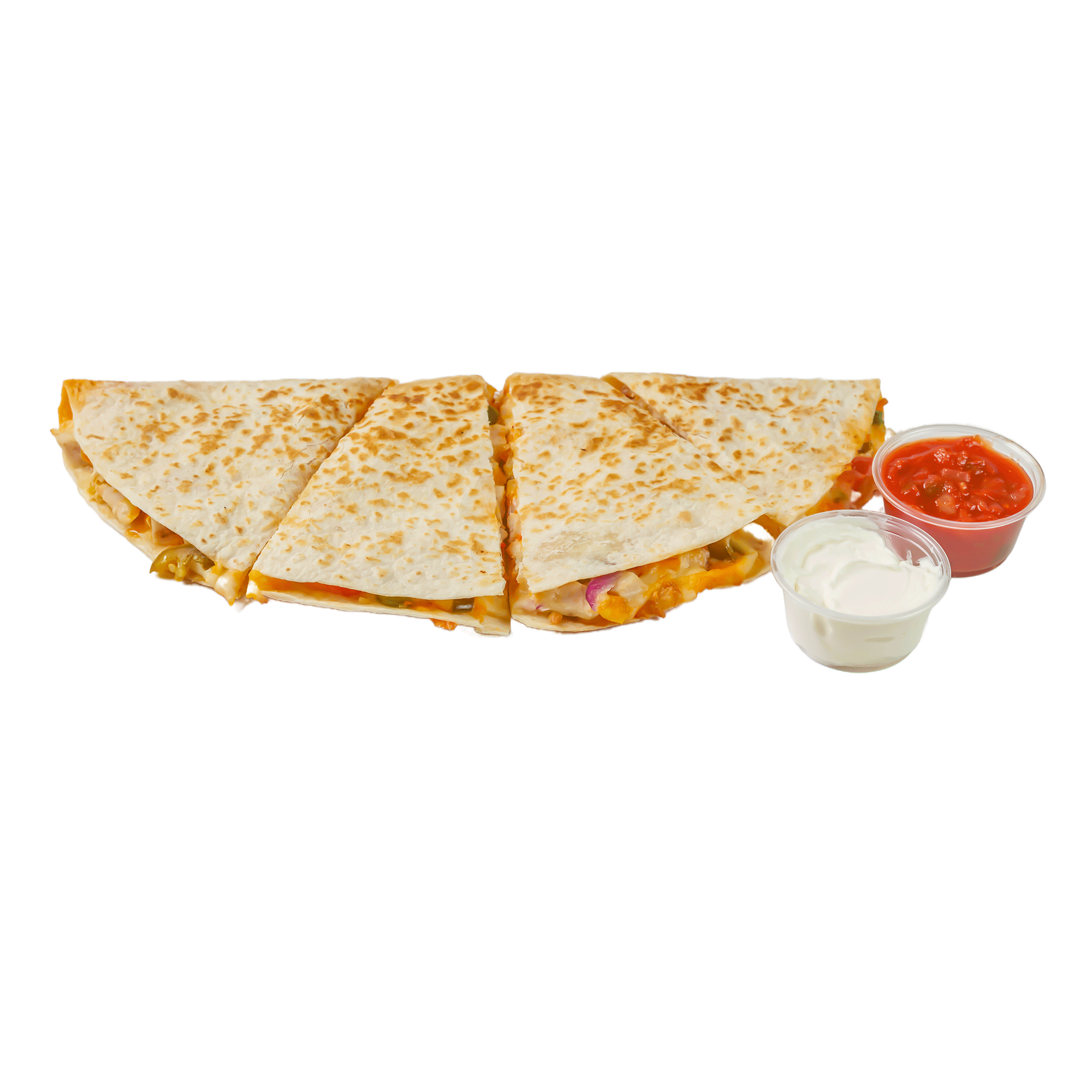 Quesadilla sauce, mixed shredded cheese, chipotle chicken, red onions, tomatoes, bell pepper, jalapenos and banana pepper, served with sour cream and salsa.