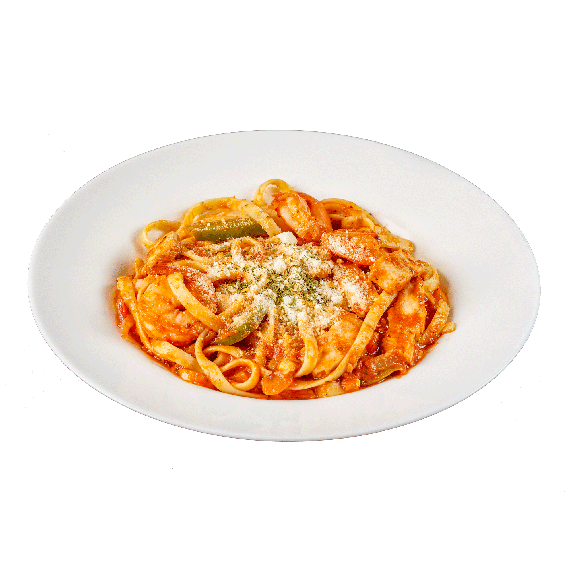 Chicken, shrimp, bell peppers, onions, cajun seasoning, marinara sauce and parmesan cheese. Served with garlic bread.