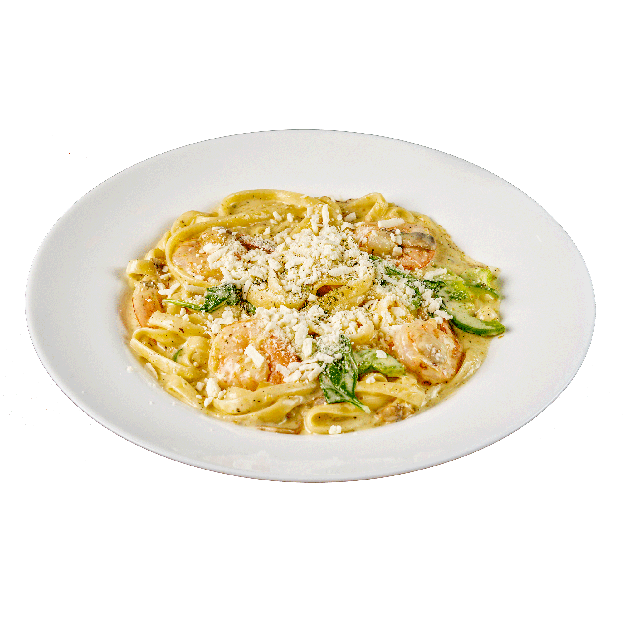 Shrimp, bell pepper, mushrooms, spinach, alfredo sauce and feta cheese. Served with garlic bread.
